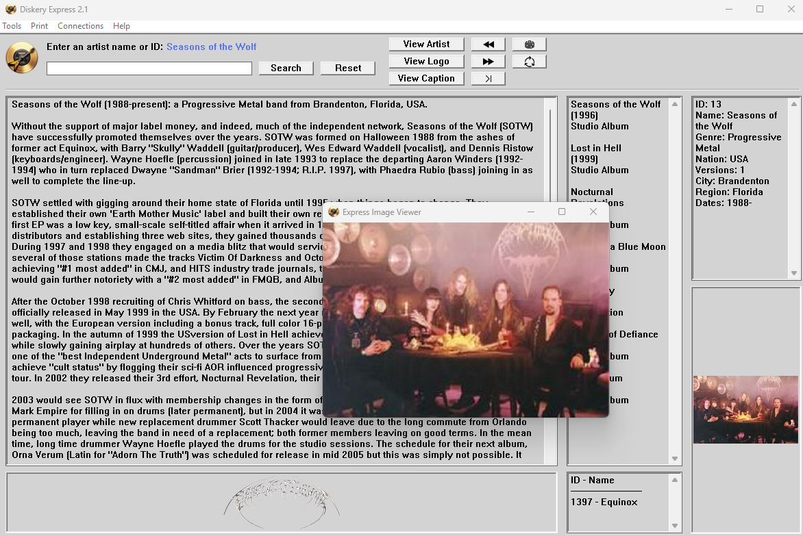 Diskery Express is a lightweight application for MS-Windows and Android, developed as a proof of concept for the Diskery API. It allows users to search Diskery's extensive music artist archives database directly from within the app, without opening a web browser.This no-frills utility is free to download, distribute, and use, and designed with simplicity and speed in mind, each standing as the first independent programs to utilize the Diskery API.